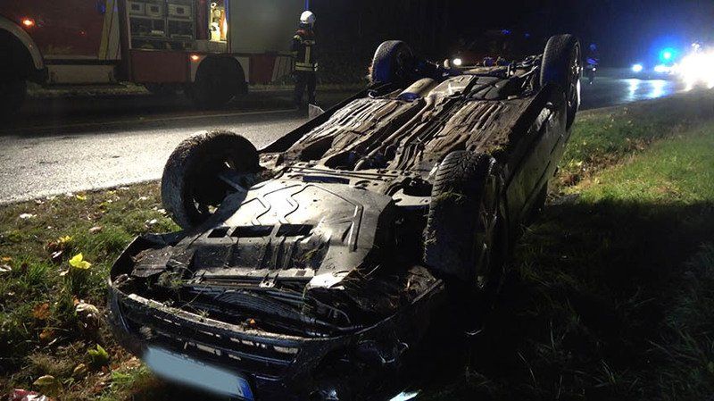 Auf nasser Fahrbahn überschlagen und auf Dach gelandet